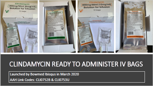 Bowmed Ibisqus has expanded the range of Ready to Administer IV Bags with the recent launch of Clindamycin. This product has been developed in strengths of 300mg/50ml and 600mg/50ml with each pack containing 10 bags.